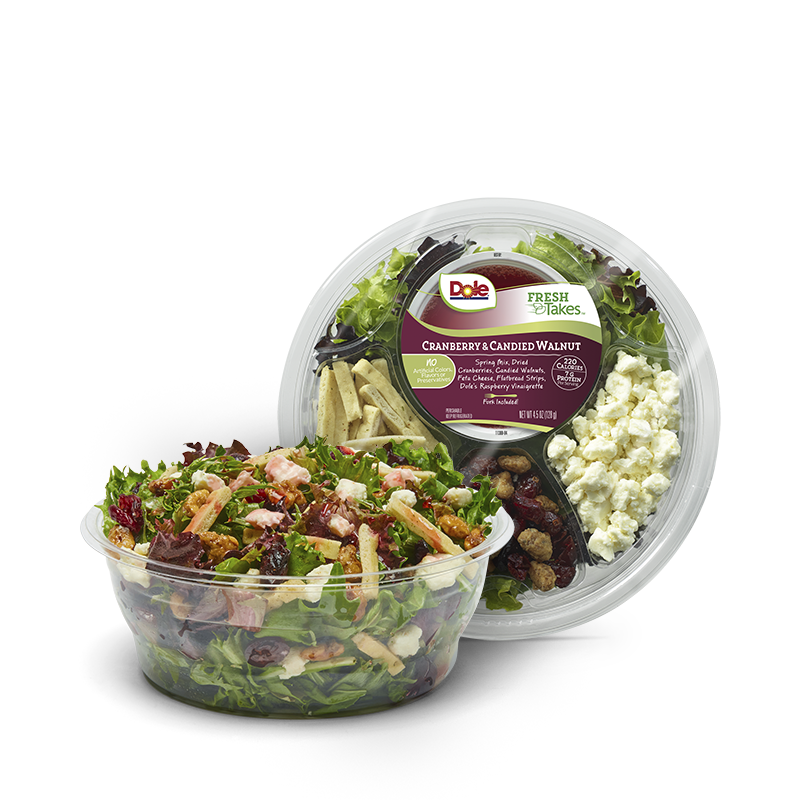 Featuring DOLE® Spring Mix lettuce and clean-label ingredients—feta cheese, cranberries, candied walnuts, flatbread strips and Dole’s Raspberry Vinaigrette Dressing—to provide a superior eating experience that is flavorful, convenient and satisfying enough to eat like a meal.