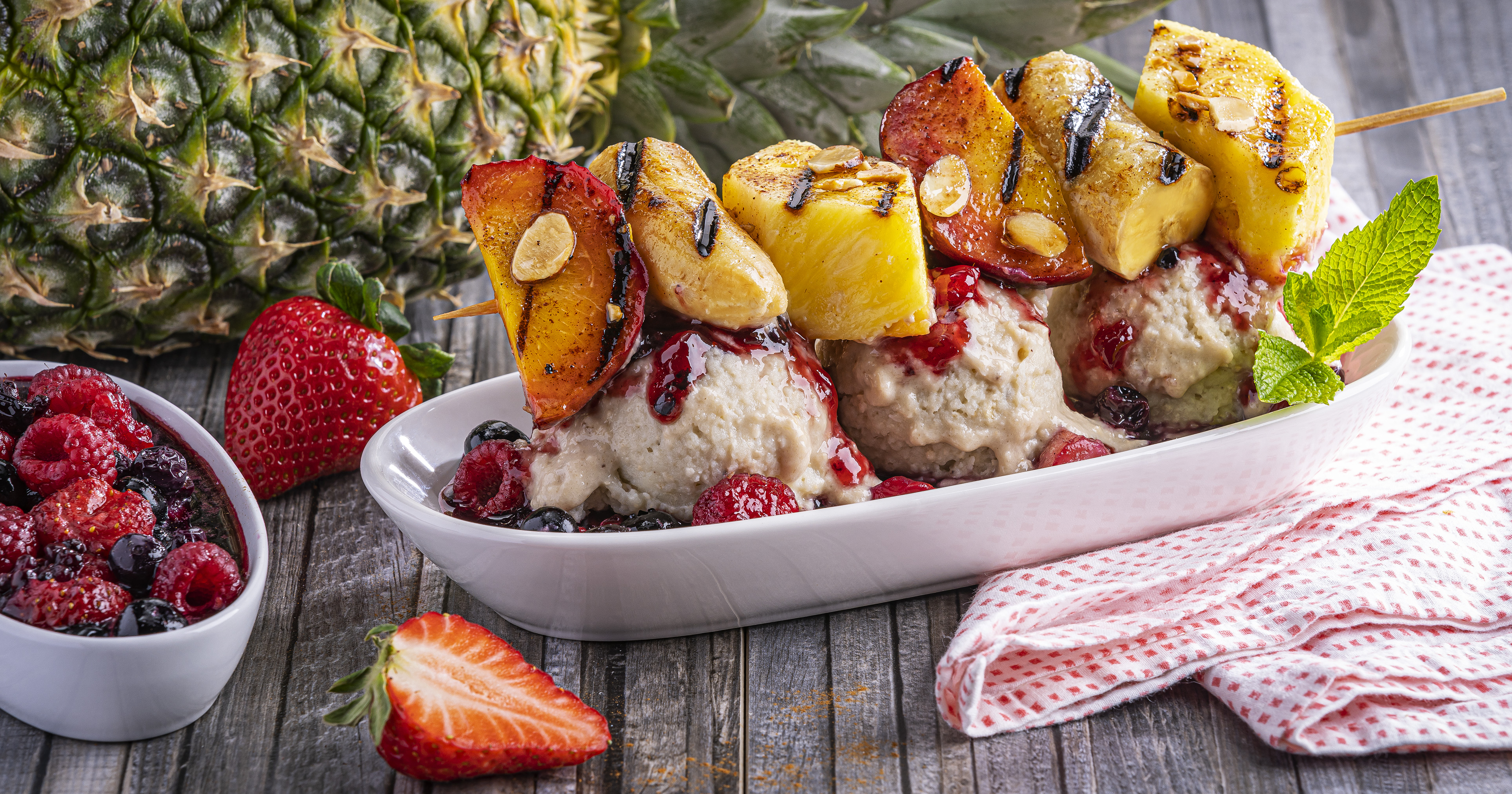 - Arrange skewers on serving plates with a scoop of the frozen banana, a spoonful of Fresh Berry Sauce, a sprinkling of almonds and mint.