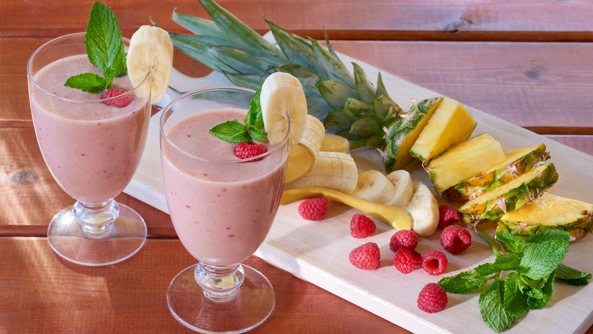 - Combine banana, pineapple, raspberries, almond milk, ice, mint, and honey in blender or food processor. Cover; blend until smooth. Garnish with reserved banana slices, raspberries and mint sprigs, if desired.