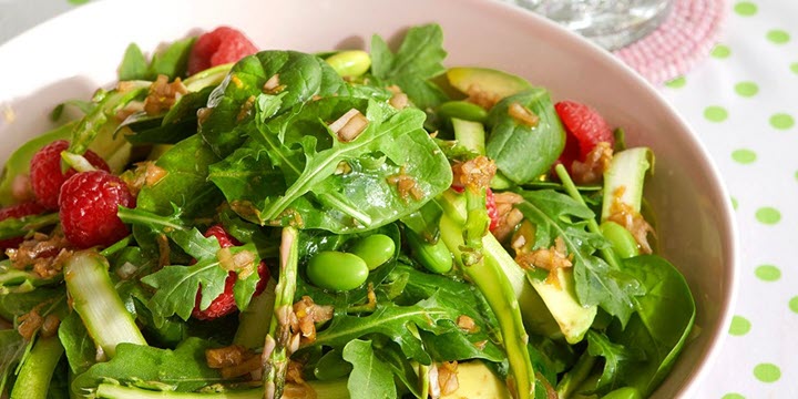 - Transfer salad to four serving plates. Arrange sliced avocado, raspberries and edamame over salad.