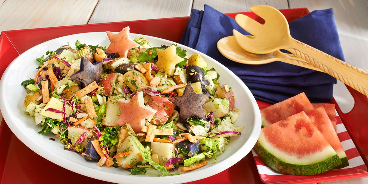 A fun twist on an all-time summer favorite. Red, white and purple potatoes are cut into star-shaped garnishes to make this salad a patriotic addition for your Fourth of July picnic - or anytime! The potatoes are tossed with a cilantro pesto marinade that pairs effortlessly with the ginger dressing and crunch of the DOLE®