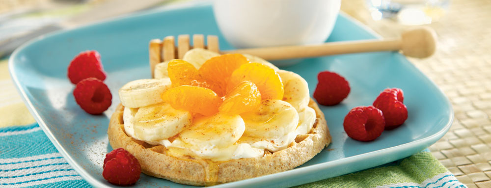 - Spread waffles with yogurt. Arrange banana slices on top, overlapping. Arrange mandarin oranges in center of each pizza. Drizzle with honey. Sprinkle with cinnamon. Garnish with raspberries or blueberries, if desired.